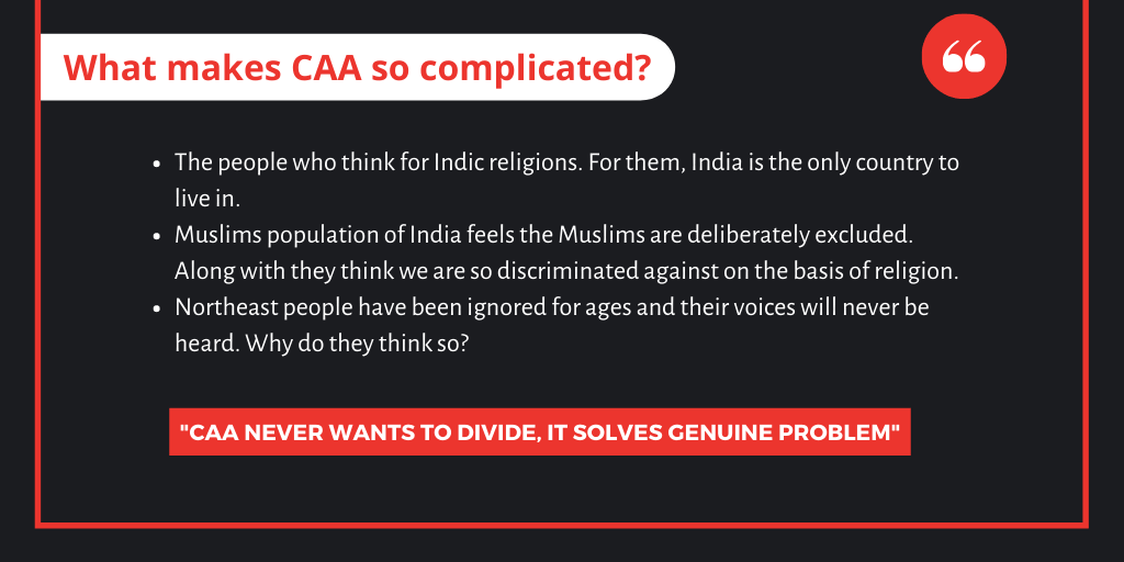 The 2019 bill (CAB) is made on the basis mentioned above, So opposition leader please stop opposing the CAA Act of 2019. The Act applies to every state and Union territories with limitations as may be applicable seek to changes the Citizenship Act, 1955 to make illegal migrants who may be Hindus, Sikhs, Buddhists, Jains, Parsis and Christians from Afghanistan, Bangladesh and Pakistan, eligible for Indian citizenship. It has decreased the minimum residency period in India to 7 years from the earlier 12 years to apply for citizenship. The bill includes a plan to cancel the registration of Overseas Citizen of India (OIC) in case they infringe any law. In principle, there is no debate on the OIC issue except that it is a bit vague since it does not list out particular crimes.”