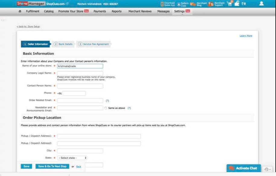 - As soon as you move forward to submit this popup, another tab appears asking for the seller information. Here information regarding your company and contact person’s information is required to be furnished. Then you need to give the address and contact person information from where shop clues or its courier partners will pick up items sold by you at ShopClues.