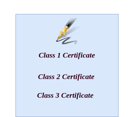 | Class 3 Certificate | Issued for individuals as well as organizations. These are the high assurance certificates, primarily intended for e-commerce applications, they shall be issued to individuals only on their personal appearance before the Certifying Authorities. | It is important to environments where threats to data are high or the consequences of the failure of security services are high. It may happen that it includes very high-value transactions or high levels of fraud risk. |