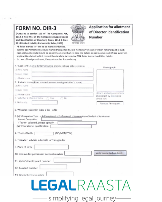 DIN stands for Director Identification Number. As the name suggests, DIN is used to uniquely identify each director uniquely. The Process for acquiring the DIN is now incorporated within with SPICe e-form (INC-32) for a maximum of 3 directors. For existing companies, Directors can apply for DIN by filling DIR-3 form. - Name Approval
